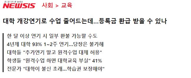 대학 개강연기로 수업 줄어드는데…등록금 환급 받을 수 있나 :: 공감언론 뉴시스통신사 :: (newsis.com)